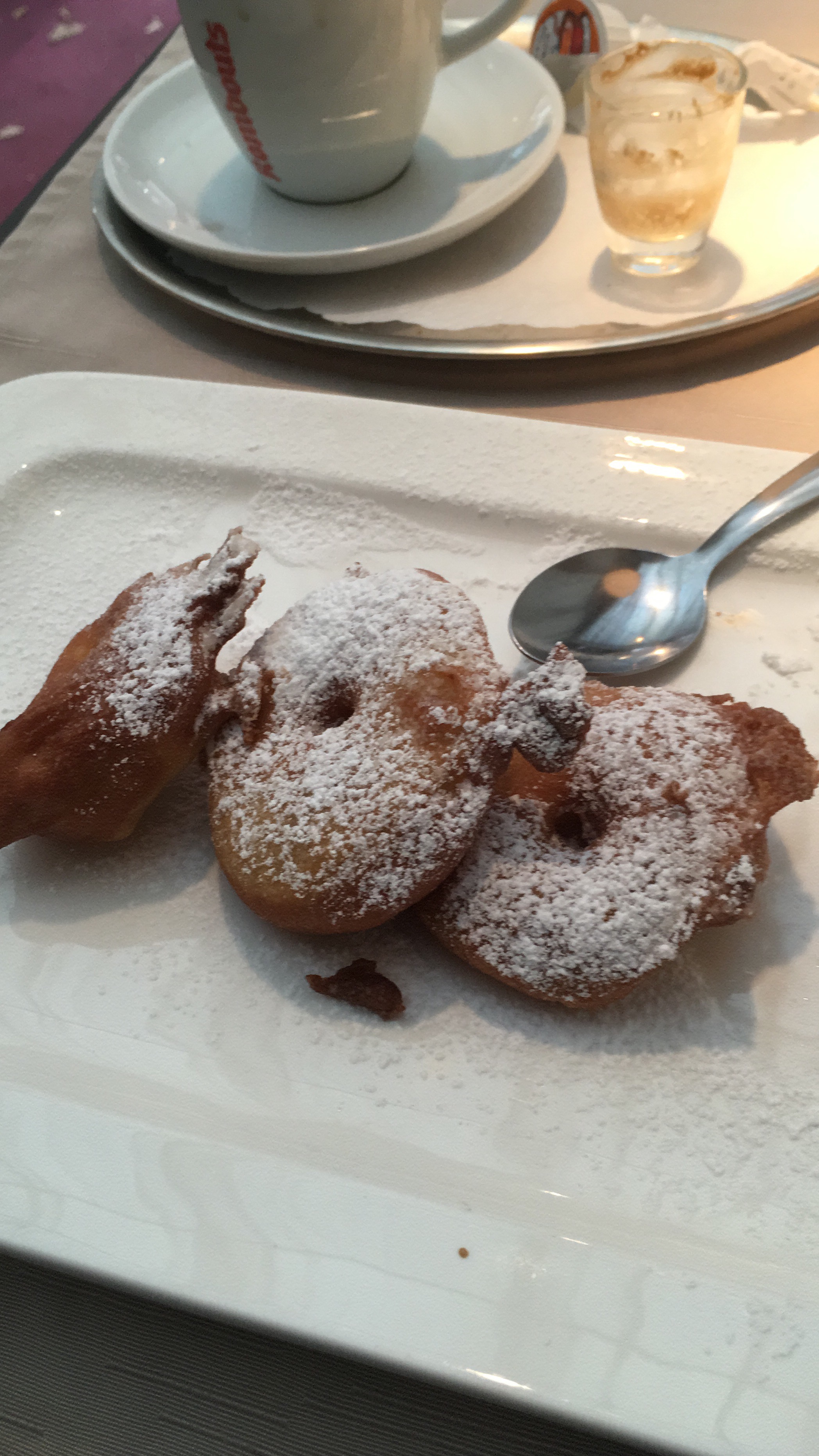 Before leaving the city, I stopped to rest my feet at a little cafe on the way to the train station (which, btw, I have yet to get lost in Brugge. You can follow the crowds everywhere you need to go. And the chocolate!! There were chocolateries everywhere!!) I decided to get a coffee at the cafe, and they happened to have apple beignets. Now, after being first introduced to beignets in New Orleans at Cafe DuMonde, I am super weary of trying them anywhere else. OMG, these apple beignets rivaled Cafe DuMonde!!! Needless to say, I sent a photo of the beignets to my parents to tease them.