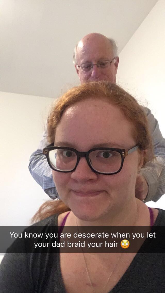 My realization – first: it is really hard to braid your hair behind your back. So I tried getting dad to do it: