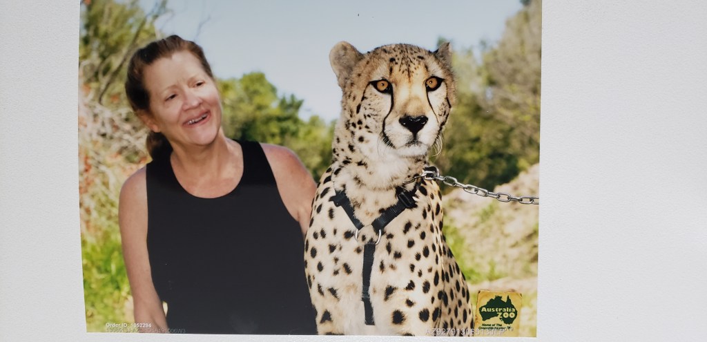 Dawn really, really wanted an experience with her favorite animal, the otter, but all of those had been sold out for weeks (the Queen’s Birthday Holiday at work against us again). However, there was one slot that had come open. It was for the cheetah experience. And we jumped on that “like a rat up a drainpipe” (Aussie saying). Lena had done the cheetah experience, so Mom was going to get the opportunity to follow in her footsteps.