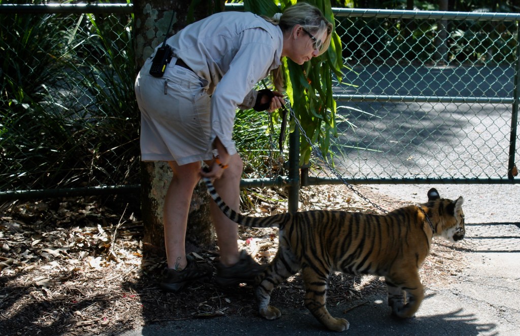 The binturong experience was that afternoon. And the next morning (the Queen’s Birthday Holiday), we rushed to the Zoo only to have the red panda decide it was too hot to come down from his pearch high in his tree. Her money was refunded and she had to run for the leaping lemur experience. I stumbled upon the 18 week old tiger cub while he took his daily stroll through the Zoo. Apparently, I made him nervous when I went to my knee for a photo, and was asked by his keepers to stand while shooting my pictures.