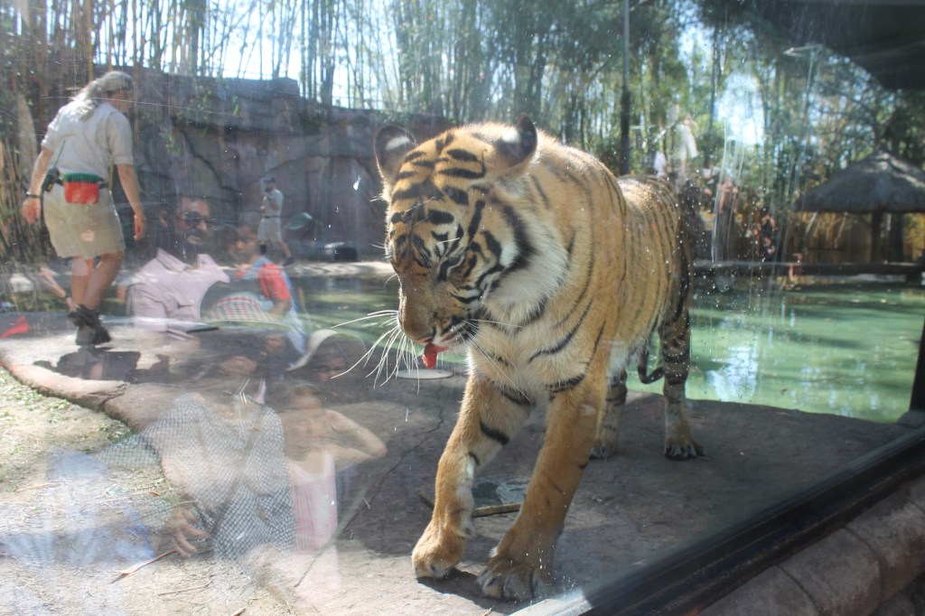 While waiting for her final adventure with the echidna (look it up, it is the strangest animal in a land full of really strange animals), Dawn joined me at the mature tiger enclosure for the daily tiger training exercise. See the crowds in the reflection in the glass walls as the keeper put this Sumatran tiger through his exercises. The keepers proudly announced that the Zoo was the sponsor of millions of dollars of tiger protection research in Sumatra where the tiger is critically endangered.