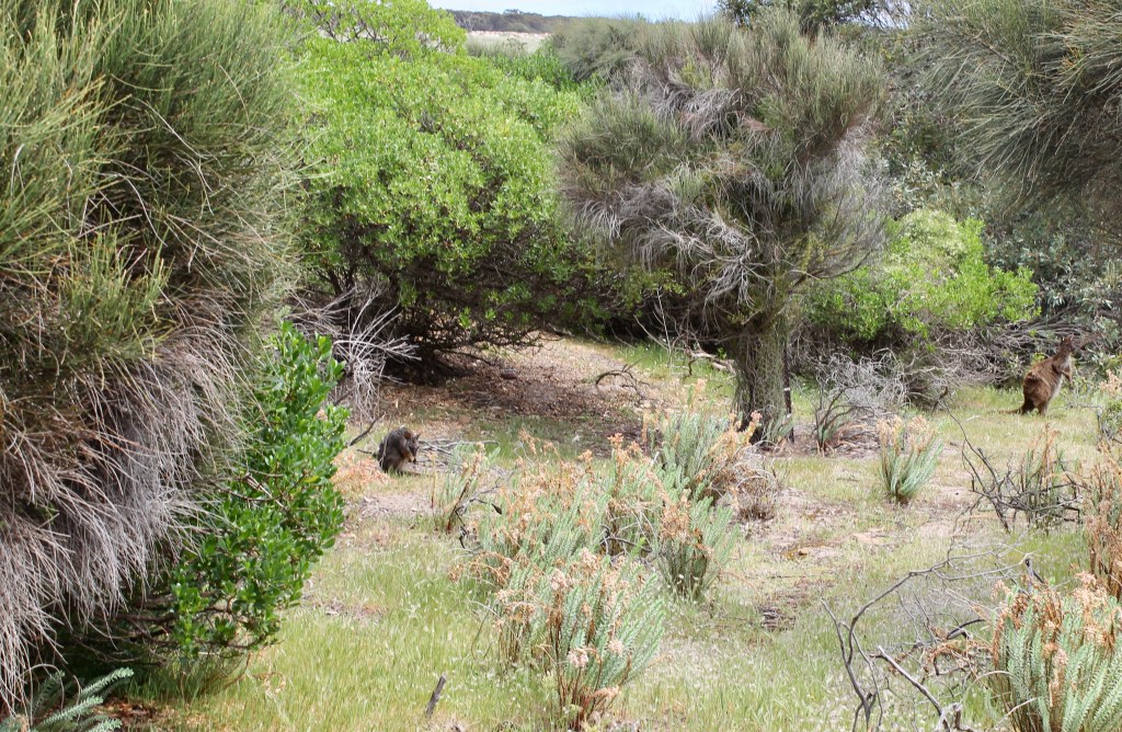 The original native wildlife of Kangaroo Island include both a separate subspecies of Kangaroo (much darker than their cousins on the big island) and a subspecies of wallaby, the smaller cousin of the kangaroo. We found both at the Stokes Bay on the north (British named) side of the Island – wallaby on the left and kangaroo on the right (Bay at the top). The wallabies were a little rare today but the kangaroos were numerous, including at least three joeys.