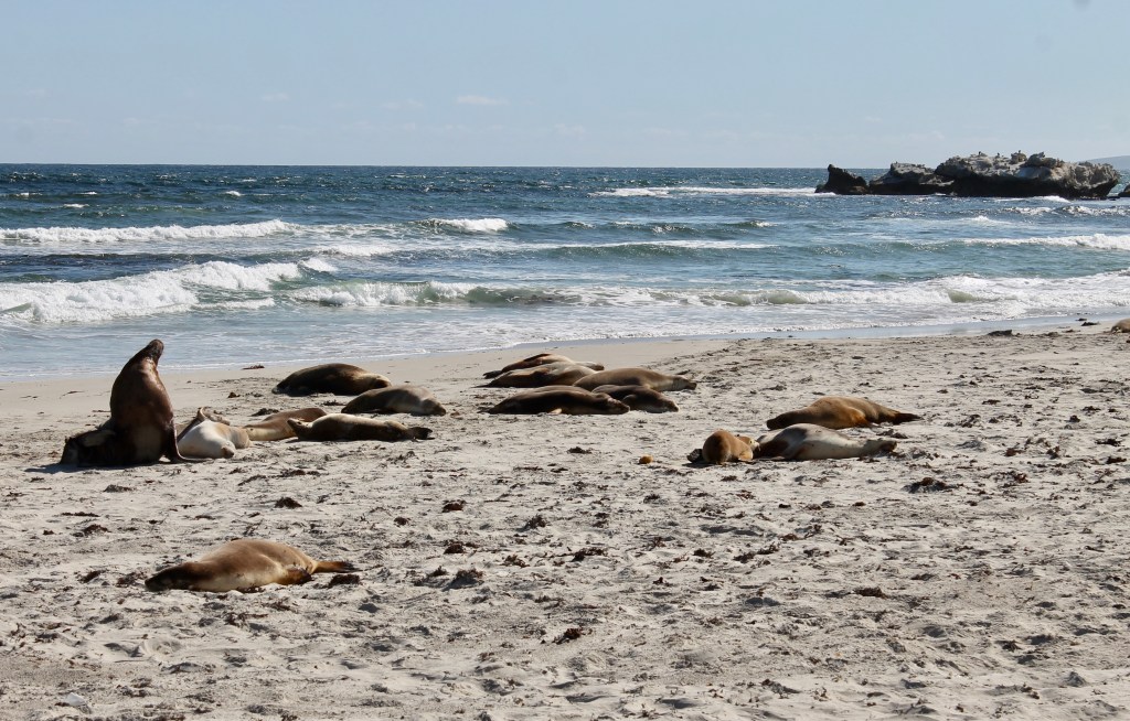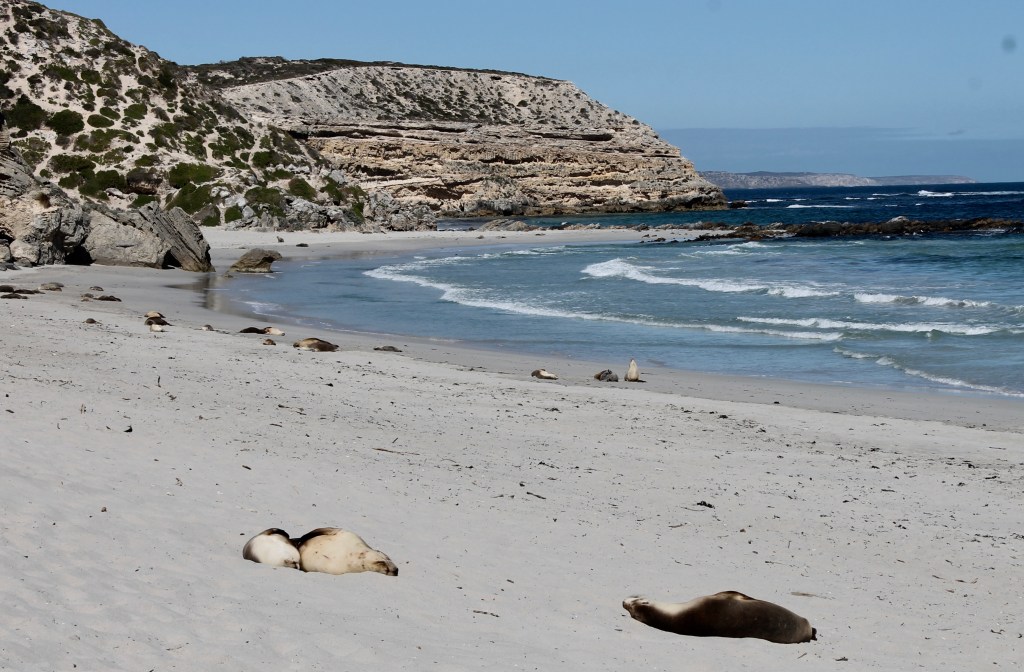 Our final trek of the day took us to the south (French named) side of the Island to Seal Bay. Protected by coral reefs that tore the bottom out of the seal hunter’s ships, Seal Bay is the last home of the hair sea lion (the larger cousin of the fur seal) on Kangaroo Island. Sea lions only reproduce at the location of their birth. They were hunted to extinction on the other beaches of Kangaroo Island. Seal Bay is the third largest colony of Australian sea lions in the country.