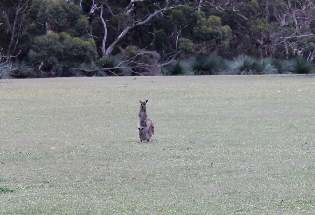 After walking among the labyrinth of granite sculptures, we loaded up the tour truck and made a quick visit through a recently abandoned farm that is the newest addition to the Flinders National Park (that covers approximately 28% of the Island). We saw dozens of kangaroos and one juvenile making (probably) his first investigation of an echidna (his jump upon touching the quills created laughs all around the truck). Then we got the sight that all tourists crave in Australia, the mom and her joey looking directly at you.