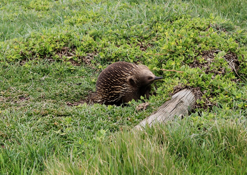 Just east of the penguin beach, hundreds of fur seals live year round on the rocky outcrop at the top left of this point. And on our way from Nobbies View (Nobbies is the tall round island in the top middle) to our hotel along a gravel road, we came upon an echidna eating beside the road. This time we were able get a picture.
