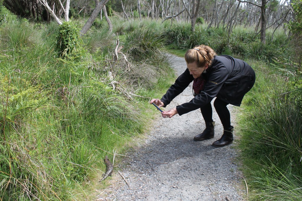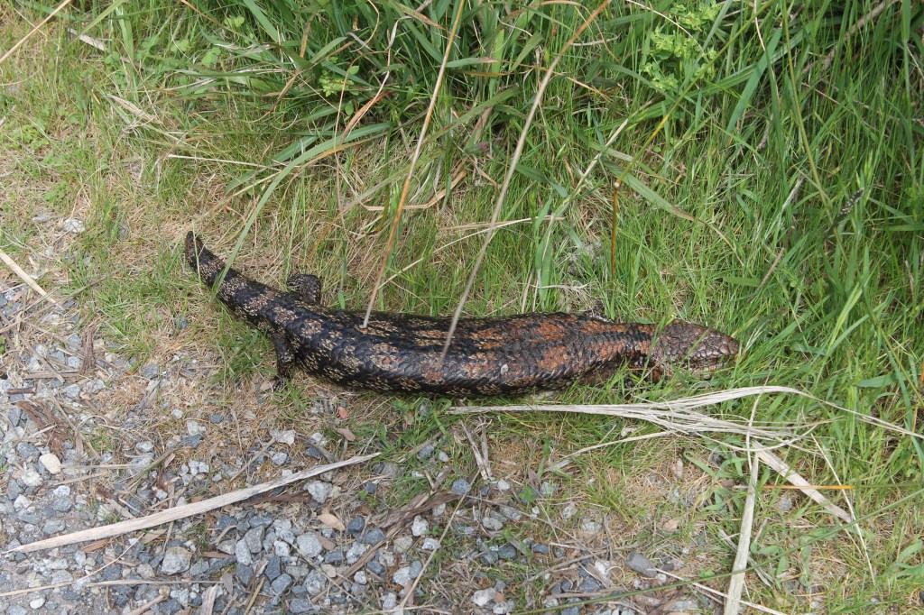 After a quick seafood chowder back at the hotel, we drove to the cold evening damp of the Penguin Parade (along with hundreds of other humans). The Parade officially began at 8:05 pm as the first wave of penguins arrived and ended about 10pm (but the rangers said more penguins would continue to arrive for hours). The sight of hundreds of little penguins suddenly emerging from the water in wave after wave was amazing but the sound of the adults and chicks as they reunited was magical. We lingered in the dark of the path back to the parking lot as long as possible savoring the moans of the adults and the clicks of the chicks in the hills (and watching the adults waddle down the many paths into the hills of the Penguin Parade center for these reunions). The next morning, we returned to Swan Lake near the center. In the path to the lake, we discovered one of the 389 species of skink in Australia. Dawn is the “lizard lady” (and has four pairs of lizard earrings to prove it), so she spent several minutes documenting our discovery. Australia has some of the largest species of skinks on the planet.