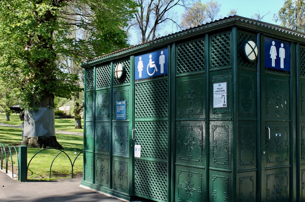 Also, the design of some of these municipal facilities is interesting. In Adelaide, they were just dull gray metal boxes but in Melbourne they were a little more fancy in the parklands: