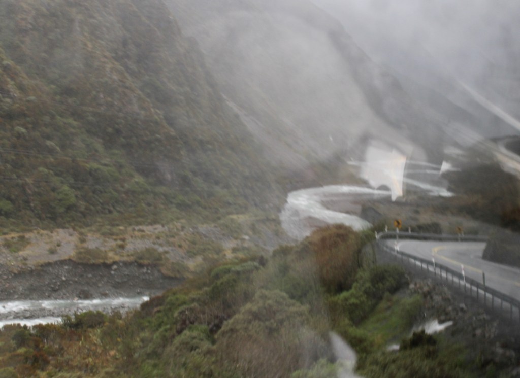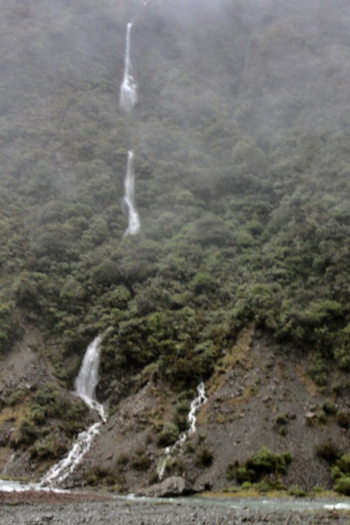 By the time we arrived at the transfer point to the buses, the rain was falling steadily and the temperature was cold. The silver lining in the clouds was that at this point on the rail line, the train tracks entered a five mile long tunnel that took ten years to build in the 1880s. The buses would have to go over the pass that was originally built for the horse teams to pull gold over the mountains to Christchurch. The rain made sure that all the waterfalls on this road were full and the view (even through the bus windows beaded with water drops) was amazing.