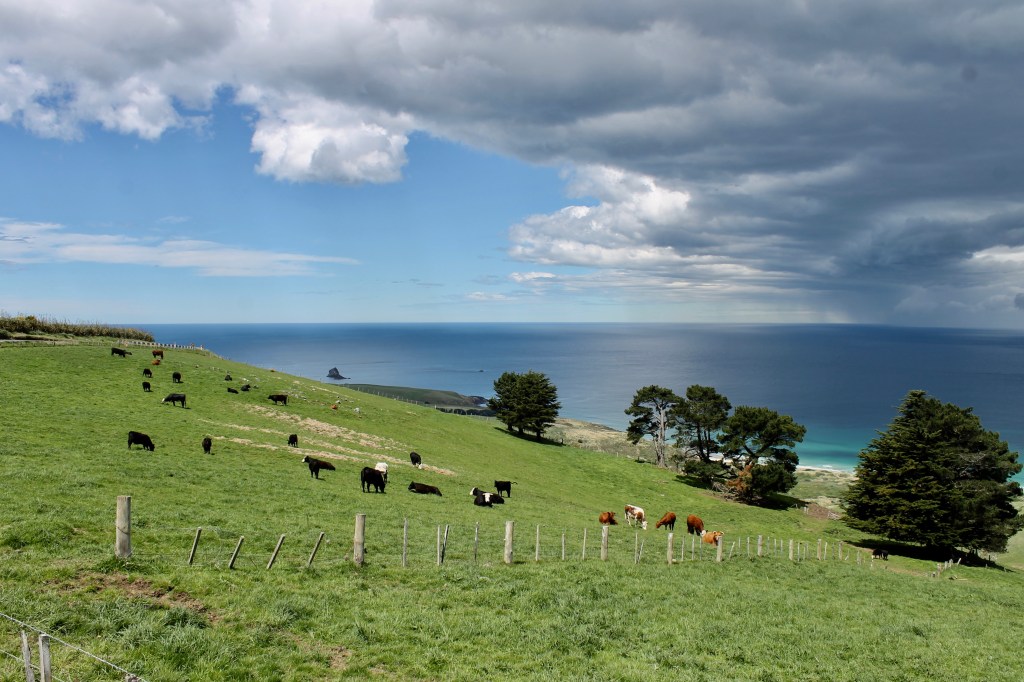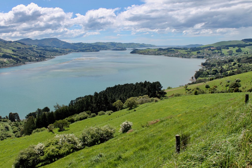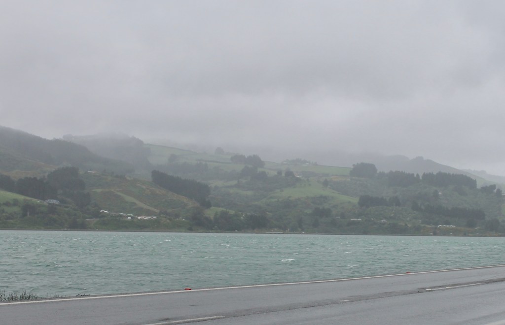 We had hoped to see an albatross when we were in the Galapagos Islands but they were out of season. We had met a couple who visited Harrington Point just days before us but the wind was not strong that day and they saw no flying albatross, so we considered ourselves lucky. The wind brought a storm with it, but it was worth the rain and wind to see an albatross take flight. For the return trip to Dunedin, we took the low road beside the bay.