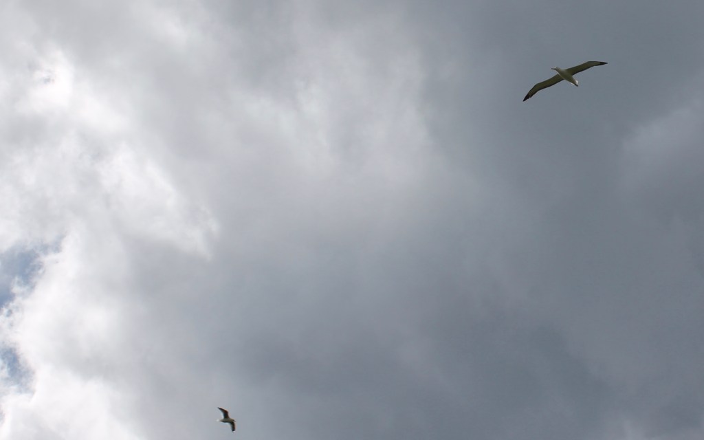 While we could see the nesting birds, what we really wanted was to see an albatross in flight. After 10 minutes, one was spotted. At almost the same time, the mate of the nesting pair on the edge stood up, took three steps, opened his long wings (nine feet) and simply launced himself into the fierce wind. And he flew right by our blind.