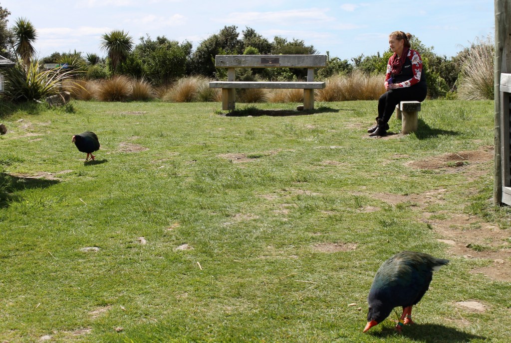 We arrived just as the staff finished feeding the takahe. If you remember from the Te Anau blog, these flightless birds were believed to be extinct until 1949. Unlike the avairy in Te Anau (where we met our first takahe), there are no fences around these birds other than the one around the center. So we just walked up on the takahe eating grass.