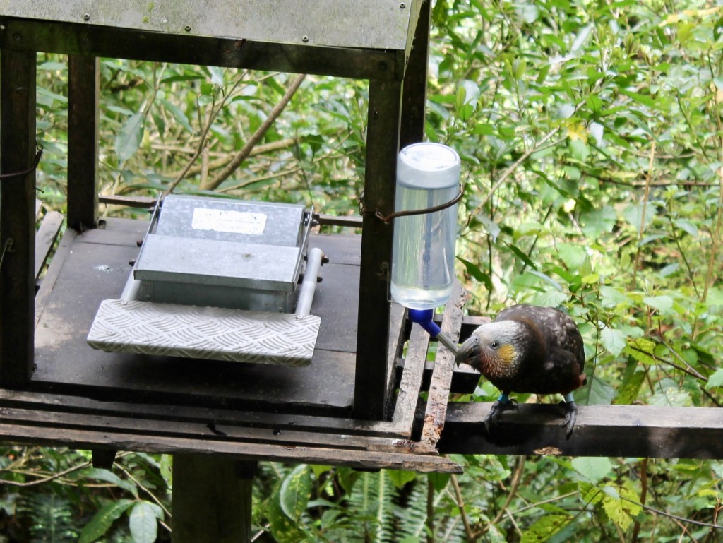 Then we crossed through the knee high internal fence that kept the kiwi confined to a smaller portion of the center. Kiwi are noctural, so we had no chance of seeing any of the pairs that the center is nuturing. We were now headed deeper into the eucalyptus grove for the next feeder. There we found another dominant tui trying to protect his turf (the tui has a really beautiful song that has become Dawn’s favorite), but they are very territorial. Within five minutes of our arrival, a large bird emerged from the forest to challenge the tui. It was a South Island Kaka, a brown parrot with red under-wings (endangered mostly due to loss of habitat).