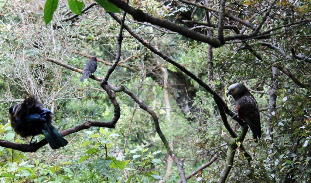 With the kaka in control of the feeder, the other birds just waited for it to fly into a nearby tree. The closest bird is a tui (landing on the limb as I took the picture), the kaka is on the right and one of about half a dozen bellbirds is furthest away.