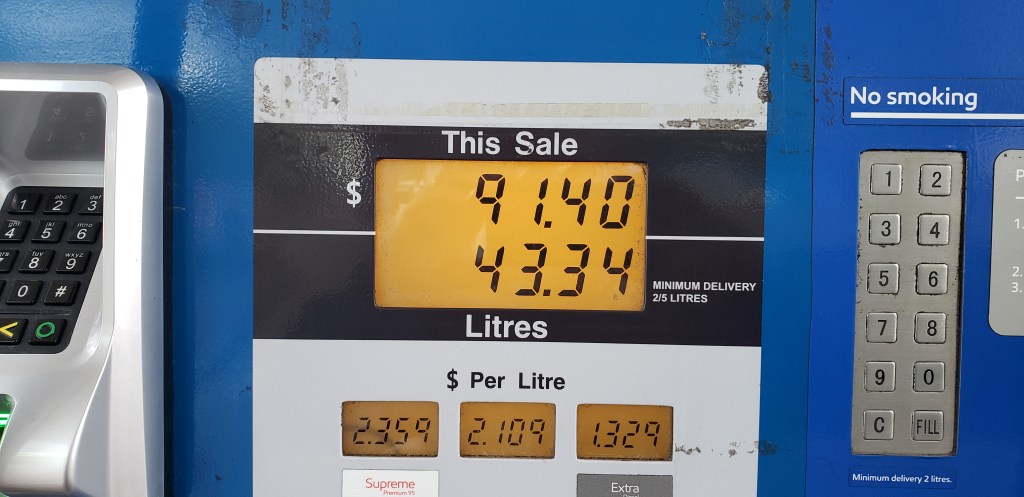 Since our hotel was nice, the Raxter Travel Rule would say that we were about to have bad dinners. We had driven 4.5 hours from Dunedin along mostly two lane road (through beautiful rolling hills of farm land) . NZ roads are a time travel back to the 60’s when even US highways went through the middle of every town. Usually, it was just having to slow down to 25 miles a hour, but we came to a complete stop 6 kilometers from Ashburton, so we thought there might be an accident. Turns out, Ashburton (population 35,000) has only one bridge over the Hakatere River that runs through the middle of the town. It was Sunday afternoon, so it took us 20 minutes to go 10 kilometers. I would like to blame it solely on the one bridge, but you can also add three stoplights and a roundabout (which, despite supposedly keeping traffic moving better, did not move traffic any faster than a stoplight on a Sunday afternoon). Oh, and here’s what the gas for the trip from Dunedin cost.