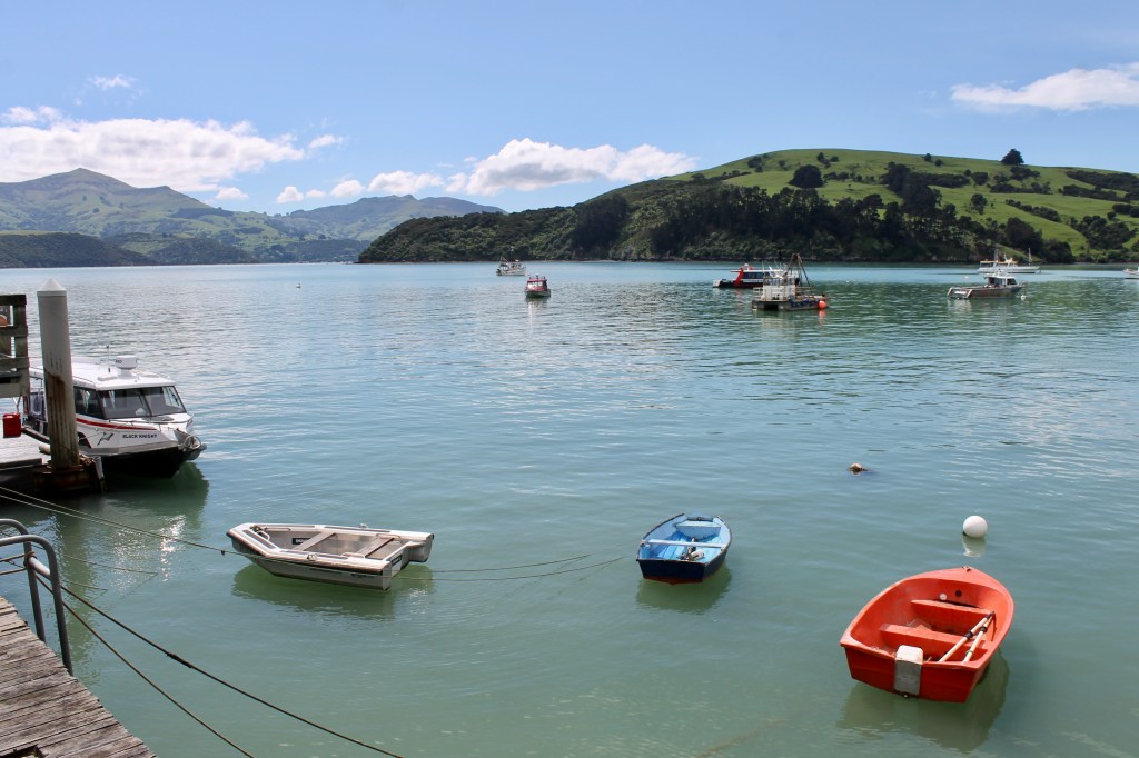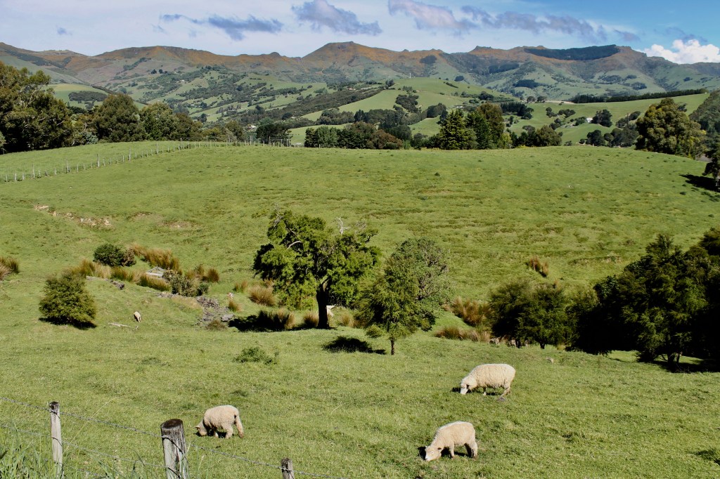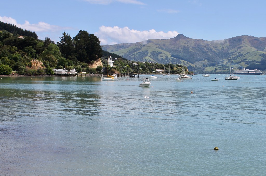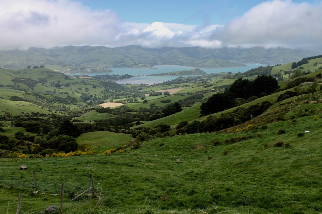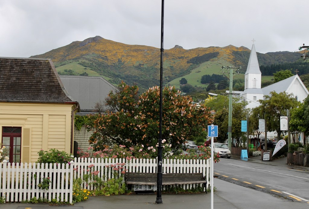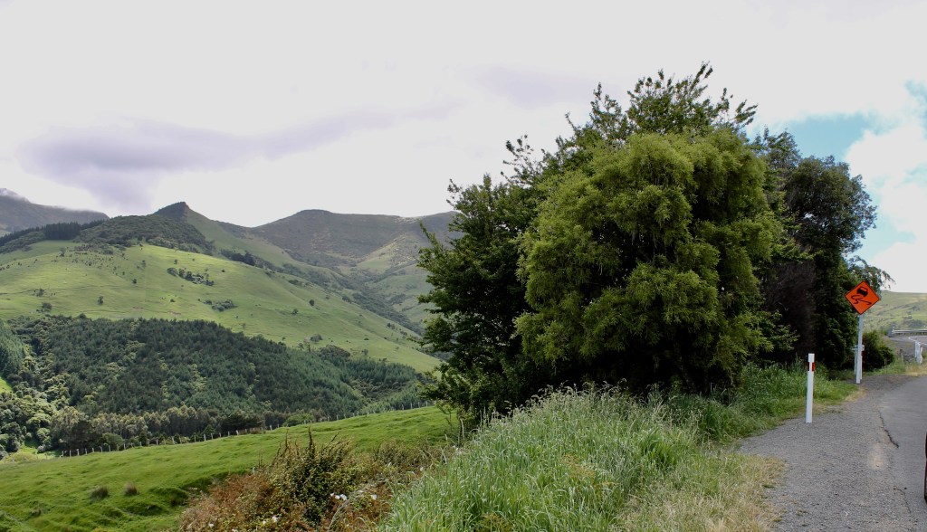 And I have gotten sidetracked again. Christchurch was just our base to go out to the Banks Peninsula. Akaroa Harbor is the home of the Hector dolphin, the world’s smallest dolphin. We had not prearranged a dolphin cruise because the weather is not predictable on the Banks Peninsula (based so far on our experience, nowhere in NZ is the weather predictable). There was blue sky with a few clouds when we arose, so we began the 50 mile drive out to Akaroa. It was mostly flat farm land until about 25 miles out. Then the road began that now all too familiar climb into the hills.
