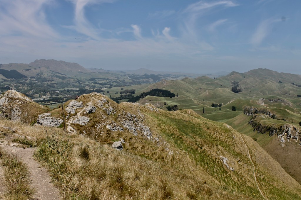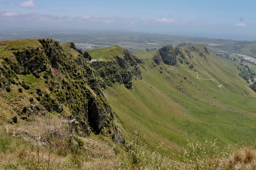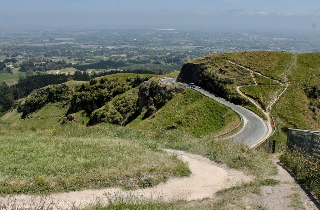 The next closest attraction was Te Mata Park about 20 minutes away. Europeans thought the rocks of Te Mata resembled a man lying down, so they named it the “sleeping giant” (sort of sounds like the grandfather mountain story). The Maori name is now used. The chief attraction of Te Mata Park was that you could drive all the way to the top of the peak (we were still tired from the steep hill in Nelson). But I was not prepared for just how this narrow crooked road would be as it snaked up the mountain slopes to a parking lot on the peak.