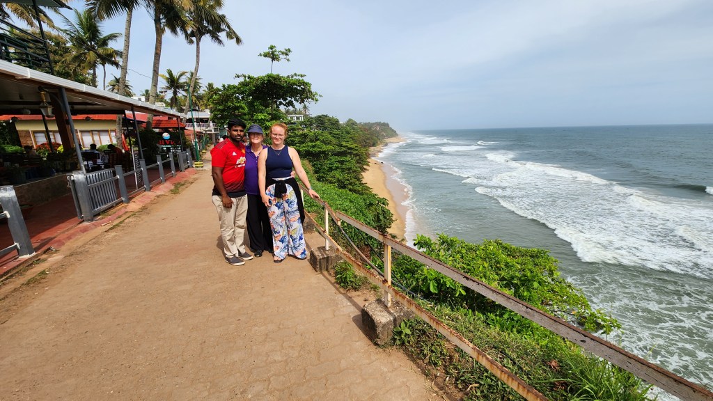 We spent a couple of hours exploring Jatayu Nature Park, then Uncle drove us 30 kilometers west to Varkala Beach. It is the only location in Southern India where there are cliffs adjacent to the Arbian Sea beach. It has been rated as the second most stunning cliff beach in the world and declared a national geological monument by the Geological Survey of India. It is also one of the few beaches in Kerala where it is relatively safe to swim, as long as you do not go too far out. The currents become very aggressive at a distance from the beach. Other beaches in Kerala have currents very close to the shore, so swimming is not recommended. Varkala is also famous for its natural springs which are said to have medicinal qualities. So the cliffs above the beach are now lined with yoga and Ayurvedic retreats, hotels, restaurants, tourist shops and clubs that attract tourists from around the world. There were more Western faces in Varkala than we had experienced anywhere else to that point in India. We toured down the clifftop walkway (shown in the picture) but elected not to eat lunch. We had some family visits to make before the day ended, so we headed south.