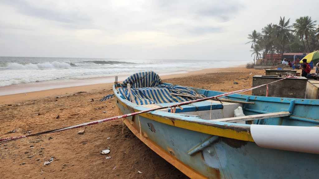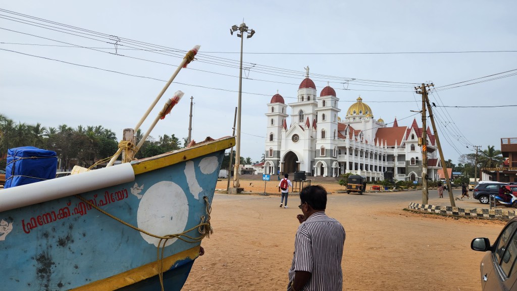 But Kingston’s family are members of the Roman Catholic Church. There is evidence of a Roman Catholic parish in Trivandrum from at least 1568. There has been a Feast of Christ the King celebration here for over 400 years. The ten day celebration now occurs at the Mother of God Church (shown in the photo above). The celebration includes a grand procession on the tenth day. The Church is literally within a stone’s throw of the beach, as shown by the other end of the fishing boat in the photo above. Also note the large waves that the currents produce here. No swimmers on this beach.