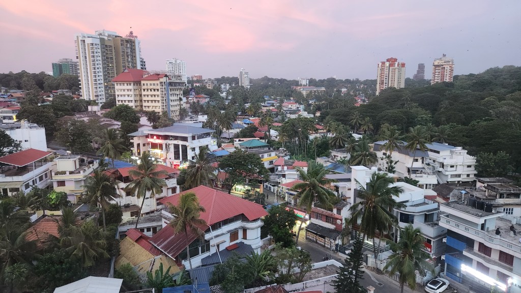 The afternoon was planned to be family visits to introduce Lena to Kingston’s extended family. But before the visits to family members, we had arranged to visit the parents of the bride of Kingston’s best friend. His friend works in the US (as does she) and attended Lena & Kingston’s Covid Wedding (ie., only ten folks at the service) in Raleigh. We got along great and he was kind enough to invite us to his wedding in Denver this past Spring, which was quite a bit larger. It was also our first Hindu wedding experience. We met his folks at the wedding. They both spoke English and were a pleasure to visit with. They were excited to hear that we would be visiting Trivandrum where they live. So they insisted that we visit. It was arranged. So after we left the beach, we again had to navigate a labyrinth of local roads before Uncle finally found their address near a canal. We were invited inside their spacious home where we were immediatley offered spiced tea (masala chai). Then they brought out numerous Kerala taste treats, including an especially good version of my favorite, Pazham Pori (banana fritters). Of course we ate way too much food because this was just our first home visit. After a very pleasant conversation and photos, we then proceeded to three homes of Mom’s sisters, nephews and neices. Each location provided spiced tea (and coffee) and more taste treats. And most of the younger Indians spoke English, so we had fun conversations about what Kingston was like as a child. However, since he was only in Kerala for short summer visits, there were not as many stories as we would have liked. Our final visit was to the apartment of Kingston’s cousin, which had a great evening view over central Trivandrum (see below). By the time we got back to our beach resort, it was after 10PM and we were quite full from all the visiting.