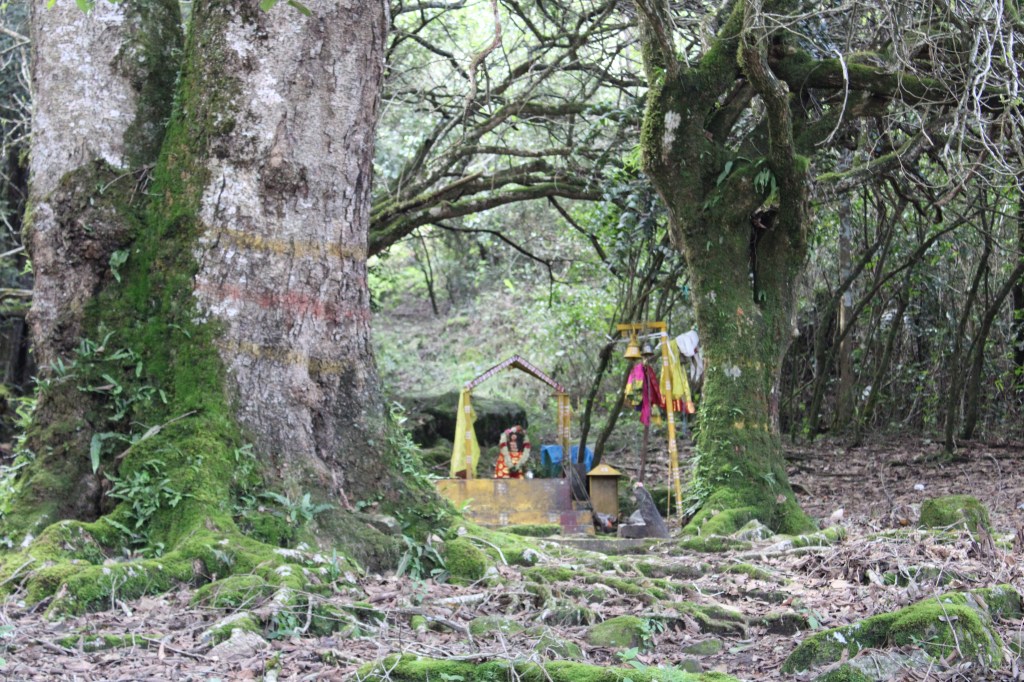 Over the last decade in the US, roadside memorials to people killed in traffic accidents have become common, particularly in rural areas of the South. These are memorials to a lost family member and generally are not maintained for more than a few years. In India, once a location has been identified with cloth, tassels or a crucifix, locals convert it into a pilgrim spot with a substantial structure where locals regularly worship. It may even become the location of a small roadside market. Some become substantial, like the two directly above, and some are simple, like the one in the National Park.