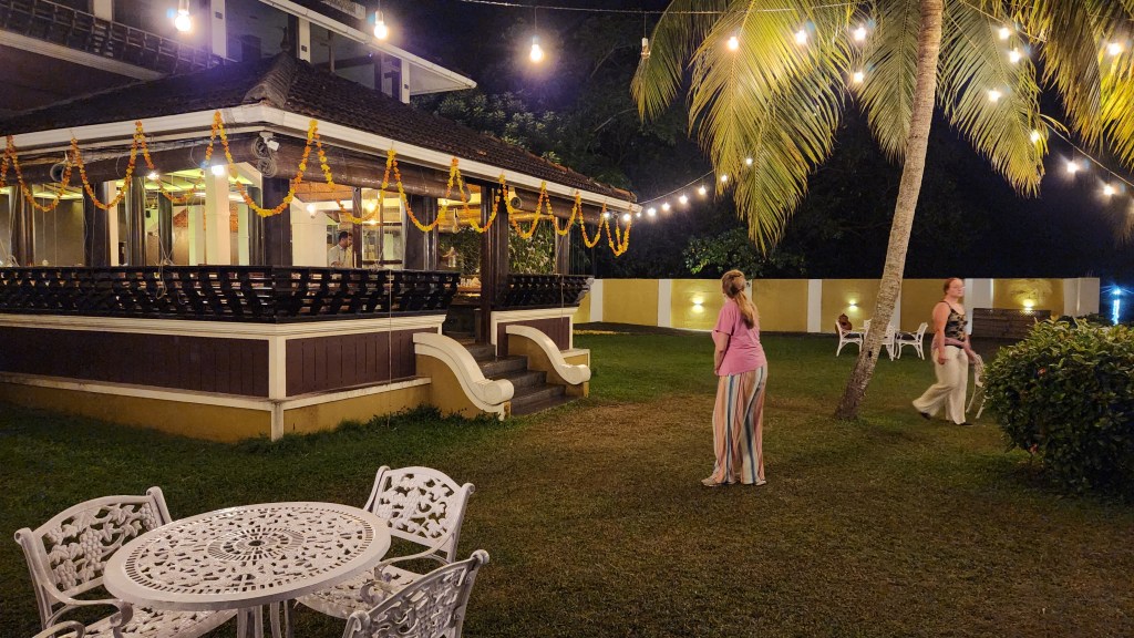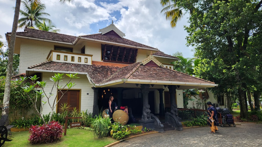We again navigated through a residential area to arrive at our hotel, but, for a welcome change, we arrived at the hotel not too late in the afternoon. The hotel is built along the lakeside. The reception area was enclosed on three sides (which maintained a cool interior from the lowland heat outside), but the front entrance was open air. Once we checked in, as with the estuary hotel in Trivandrum, they brought a golf cart to carry our luggage but this time to separate bungalows.
