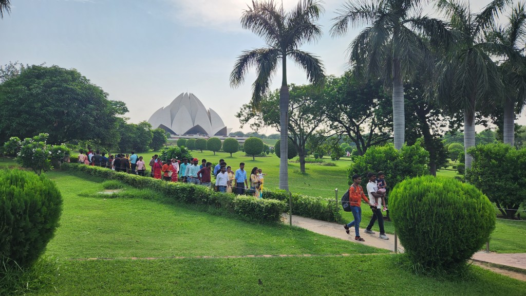 The one main hall inside the temple rises to 111 feet and can seat 1,300 people and hold up to 2,500. It is surrounded by 26 acres of plush gardens of mostly indigenous plants. Kingston and I got in the long line to enter the temple. Groups are timed to reduce over-crowding. The interior is totally open with circular seating in the round. No musical instruments are permitted and no reading or chanting is allowed unless it is religious script. In the Bahai tradition, there is no alter (just a central platform) and no pictures, statutes or images are displayed anywhere in the temple. It is totally powered by solar panels, the first temple in Delhi to do so. While we were inside, most people were sitting in quiet contemplation. Estimates for annual visitation are between 2.5 million to 5 million visitors. CNN has called it “the most visited building in the world.”