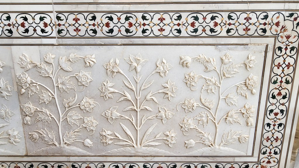 The mausoleum is not pure white marble, it is heavily decorated. The borders on each side feature 22 passages from the Quran inlaid in black marble using script calligraphy (since anthromopomorhic figures were prohibited by Islam). Astoundingly feminine and opulent, the inlaid floral designs above each arch and in the trim borders were made with 43 kinds of precious and semi-precious stone, including jade from China, malachite from Russia and turquoise from Tibet.