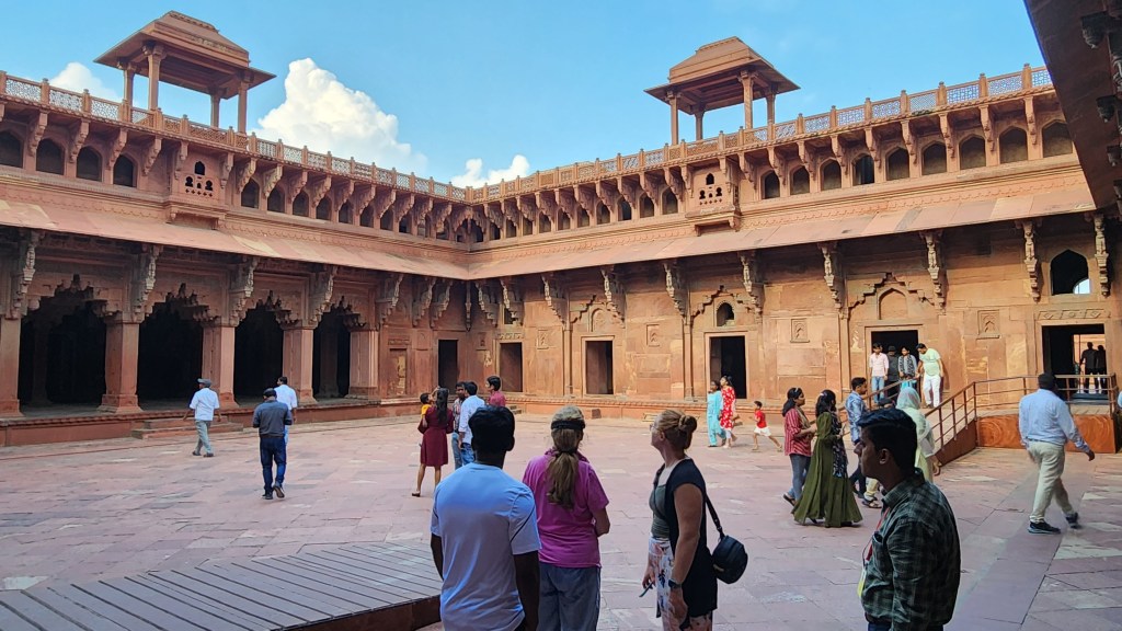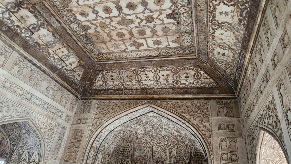 Our guide had encouraged us us to see the Taj Mahal in the morning so we could to escape the mid-day crowds and the heat (sort of – look at my pictures). The Agra Red Fort was our afternoon attraction. But first, our guide had to take us to his favorite marble crafts shop. And yes, we did buy some inlaid coasters. But Kingston and Lena bought some crafts also, so Kingston had to be careful with his comments.