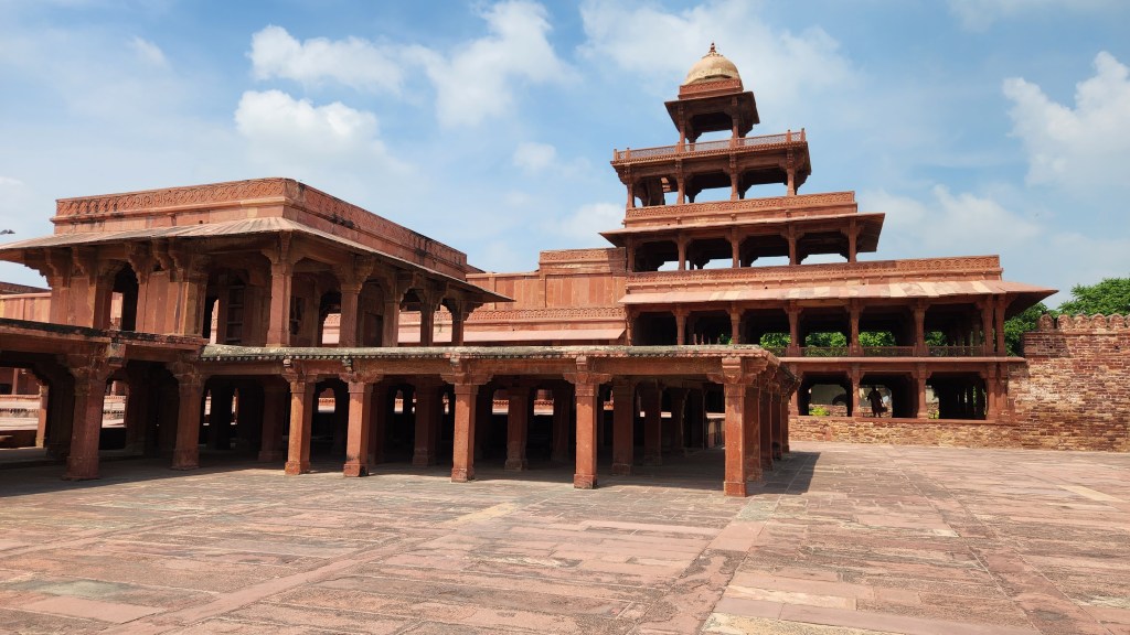 The Christi order was the first of the seven main Sufi orders represented on the Indian subcontinent. Sufism is a mystical body of Islamic practice characterized by a focus on purification, spiritualism and asceticism. It developed as a reaction to the worldliness of the early Islamic caliphates. To associate himself with this popular Sufi order (and further legitimaze his rule in India), Akbar constructed a walled city and imperial palace in Sikri begining on the second birthday of his son. The royal complex became known as Fatehupur Sikri (the “City of Victory”) after Akbar’s succesful campaign in Gujarat. The 22 mile roadway between Agra and Fatehupur Sikri became “all the way a market of victuals and other things, as full as though a man were still in a town, and so many people as if a man were in a market” in the words of Englishman Ralph Finch.