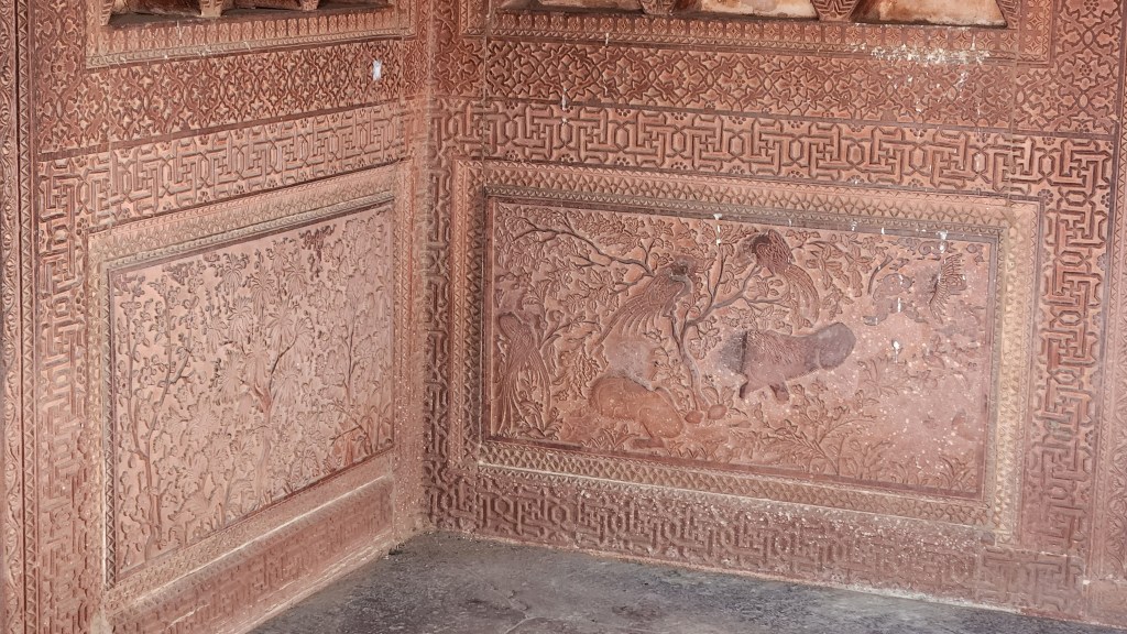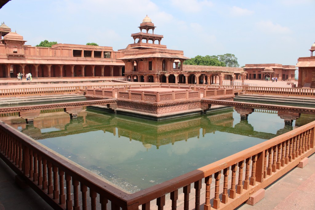 Akbar moved his capital from Agra to Fatehupur Sikri in 1572. He left in 1585 for a campaign in Punjab and only returned once in 1601. He died in 1605 and became one of the few rulers in history to have “the Great” added after his name. His royal complex at Fatehupur Sikri was completely abandoned by 1610 in part because the lake had dried up but mainly because it had been built on Akbar’s whim. Under Akbar’s centralized system of administration, Mughal India developed a strong and stable ecomony that tripled in size under his rule. He also greatly expanded Mughal rule with his “gunpowder army.” It is a testament to the wealth of the Mughal Empire that Akbar built a complex the size and beauty of Fatehupur Sikria that was only used for 13 years. But time is not kind to even masterpieces of Mughal architecture. William French returned around 1610 and noted “It is all ruinate lying like a waste desert.” Akbar’s son Jahangir stayed for three months in 1619 during a bubonic plague epidemic (and his son, to be known as Shah Jahan, studied the design of the mosque that he would duplicate in Delhi). Afgan raiders periodically plundered the abandoned buildings as the Mughal Empire weakened, so a hundred years later, that Mughal Emperor began some repair work. After the British occupied Agra in 1803, they dug wells and established an administrative center on the site which remained until 1850. They also began some restoration of the buildings. The complex is now a tourist attraction maintained by the Archaeological Survey of India.
