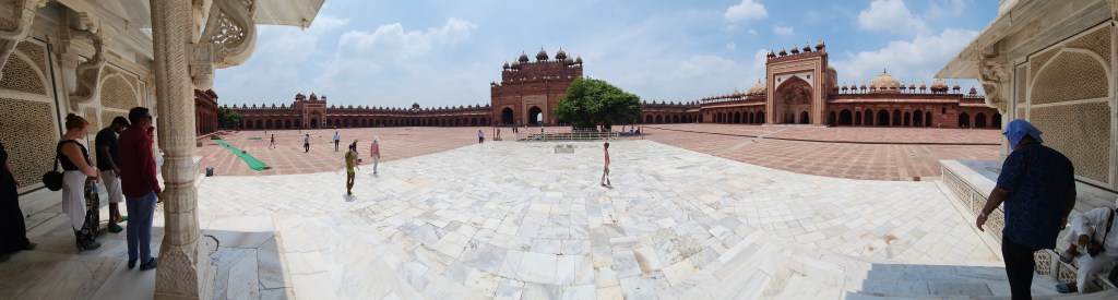 A panoramic view of the main courtyard from the Christi tomb. The gate to the right is the Buland Darwaza (the “Door of Victory”), the highest gateway in the world at 177 feet. It was built to commemorate Akbar’s victory over Gujarat. Interestingly, the inscription over the main gateway is a quote from Jesus in Islamic script: “The world is a bridge, pass over it, but build no houses on it. He who hopes for a day may hope for eternity, but the World endures but an hour.” The gateway is the entrance to the Jama Masjid (not to be confused with the similarly named mosque in Delhi built by Akbar’s grandson – the domes are visible over the wall) which was the largest mosque in India when it was built. It served as a model for later Mughal architecture. It was buit in honor of Christi and was extolled by authors for its beauty and grandeur. In 1579, Akbar delivered a sermon in the mosque (usually reserved for the religious leader). He was also known to join the population for its prayers and even swept the floors (to protray himself as a divine ruler rather than a regular ruler). But he also eliminated the tax on non-Muslims, appointed Hindus to high civil and military posts, and became well known for his tolerance of all religions at a time when religious persecution everywhere else in the world was common.