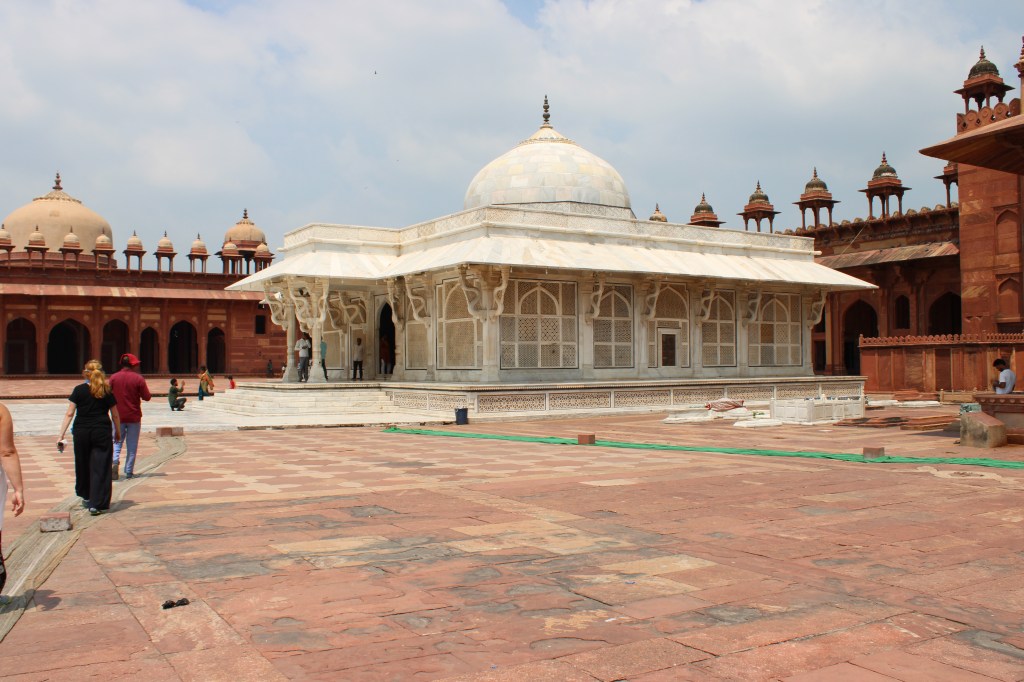 Babur’s grandson, Akbar, was heirless. Married at 14, he was still without a son at age 27. There was a Sufi Saint named Salim Christi who had built his spiritual center in Sikri. Akbar visited the Saint and asked him to pray for a male heir to the throne. Christi made a prophecy that the Emperor would produce several sons. Akbar’s first of three sons, Jahangir, was born in 1569 (to his Rajput wife), so Akbar built the saint a marble tomb in Sikri as a mark of respect for his prediction of a Mughal heir. It is still in use today and is considered one of the finest examples of Mughal architecture.
