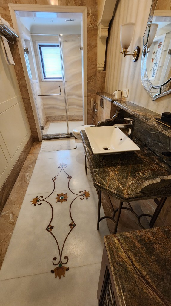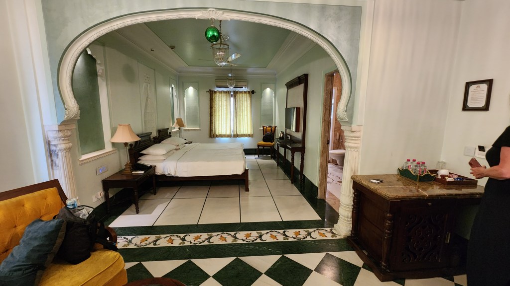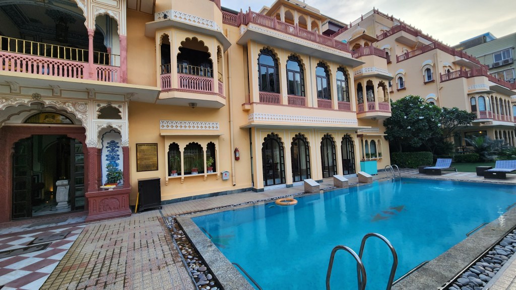 When India gained its independence in 1947, the Amber Kingdom was one of some 565 Princely States officially recognized by British Authorities (these states covered over 48% of pre-independent Indian territory). All were persuaded to merge their states into the new India in return for the payment of generous tax-free state pensions to the former royals (the so-called “privy purse” payments) as compensation for the loss of their ruling rights (and tax collections). In 1971, the Indian Constitution was amended to repeal the privy purse payments, so the former royals had to find other means of revenue. Most had royal residences in many parts of India. Rajasthan, the Indian State where Jaipur is located, has a large nuber of these residences. Some former royals converted these homes into hotels, called Heritage Hotels. We elected to experience one of these Heritage Hotels for our three days in Jaipur. So after a long day of automobile travel, this is where we settled: