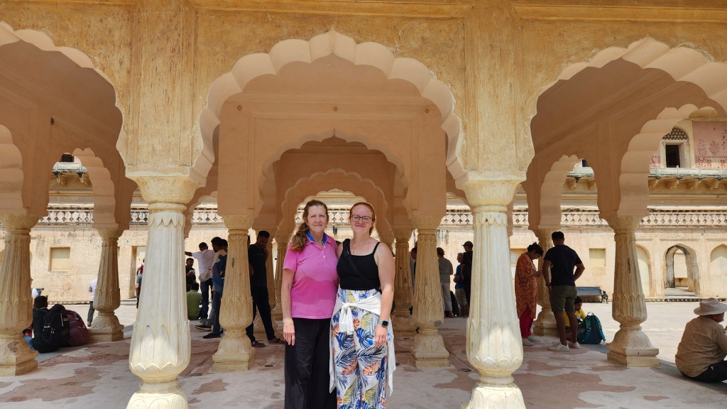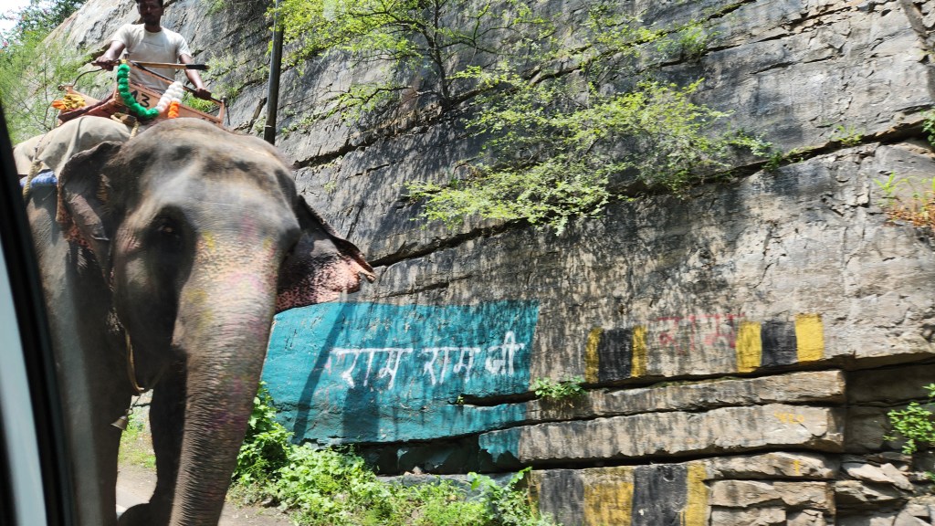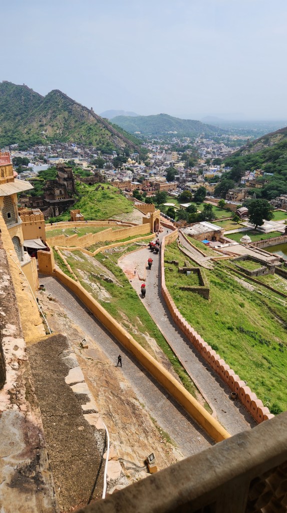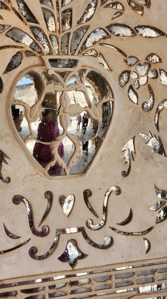 The Muslim Mughals were not the only Indian royalty with extreme wealth and an interest in building monumental architecture. Our second day in Jaipur began with a visit to the fortress built by the Hindu Rajput Amer dynasty during their alliance with the Mughal Emperors: the Amber Fort (also known as the Amer Fort), another UNESCO World Heritage Site. We finally were lucky enough to get the best guide we had in India for our Jaipur explorations. He was a former physician who became a guide in his retirement (India’s Central Medical Services has a mandatory retirement age of 65). He related the Indian history of Jaipur and Amer in conversational tone and actually enjoyed questions.