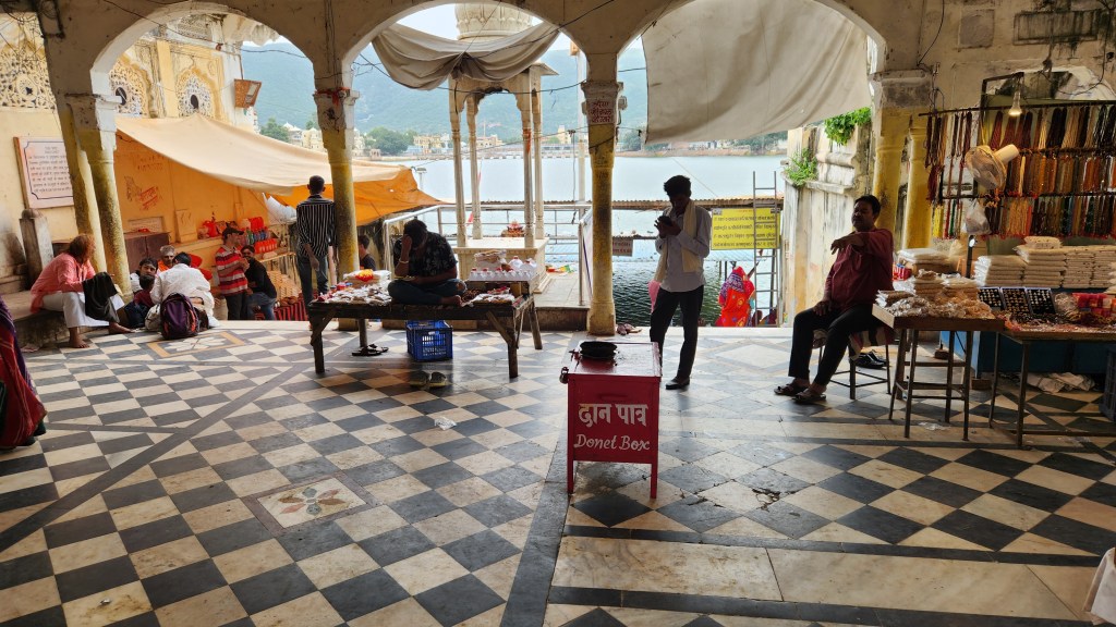 In the center of the town is a temple dedicted to Brahma, built in the 1300s. It is the only major temple dedicated to Brahma in India. In contrast, Vishnu (the preserver god) has countless temples, while Shiva (the destroyer and restorer of the universe) has 108 (105 of which are in Kerala State). The crowds were deep in the many shops surrounding the Brahma temple and there was a long line to enter the temple. Although we had been permitted into the Hindu temple in Delhi, Kingston and I made no attempt to enter the Brahma temple since we had no guide with us. Interestingly, as we wandered the streets crowded with shops, no shopkeepers called on us to buy their wares (one of the few places in India where I experienced being left alone even though I saw no other Europeans in Pushkar).
