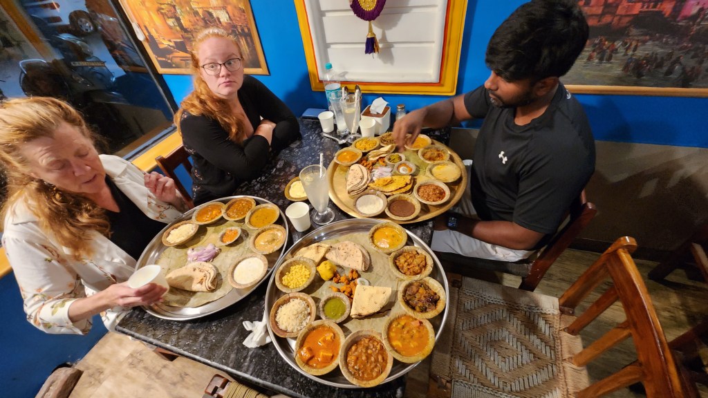 While traveling in South India, most of our hotels included both a breakfast and a dinner buffet with the room. So we had labels to explain what we was displayed on the buffet. I still had to ask Kingston questions about many of the dishes but at least I could see what I was eating before I put in on my plate. In North India, dinner was not included and we depended on Kingston to both find a restaurant and explain the menu. We ate in restaurants that offered both meat and vegetarian dishes. But for our last night in North India, we had agreed to eat a vegetarian meal. Lena’s friend from Dehli had recommended a vegetarian restaurant in Jaipur known for its Thali. The word means “plate” and it is a traditional Indian meal offering small portions of various foods. The number of dishes varies. In Kerala, the Thali is served on a banana leaf. In the Jaipur restaurant, the Thali was served on metal plates and you ordered by the number of dishes you wanted (Dawn chose 6, I chose 7 and Kingston chose 9). I was a little reluctant to have an entire meal of vegetarian dishes but the variety of the Thali was intriguing and I did find several of the dishes quite tasty. I have no idea what the names of those dishes were however.