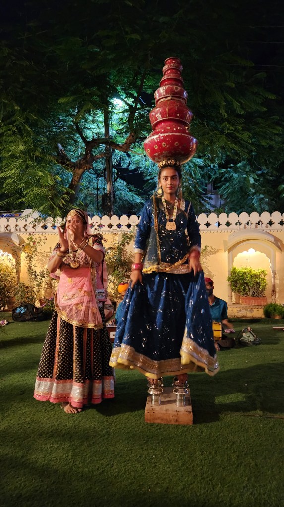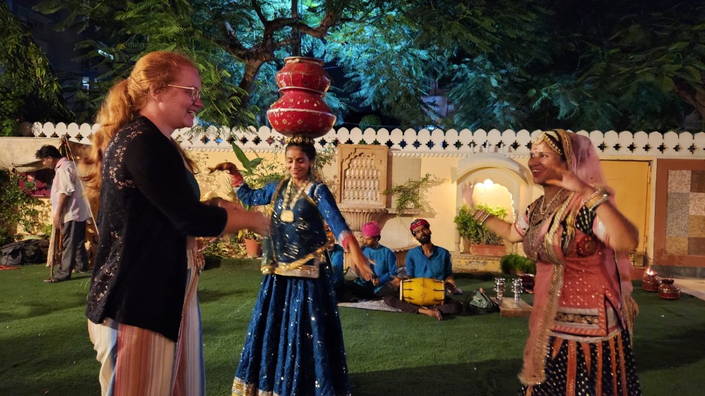 There were a number of guests who had gathered in the courtyard next to the pool to view the entertainment. The dancer in blue continued to dance with just two bowls on her head as she solicited the audience to join her. Eventually, Kingston and another young man joined Lena in the dancing. Dawn and I just watched (although in my earlier years, I was the entertainer inviting the audience to join us for the Southern folk dance tradition of Appalachain round dances). Kingston had been a dancer in school, so he had no trouble with the flowing hand jestures that were a large part of this dance tradition. Lena had a little difficulty. And I have film of both of them dancing with smiles. This was a very nice surprise to end our last night in North India.
