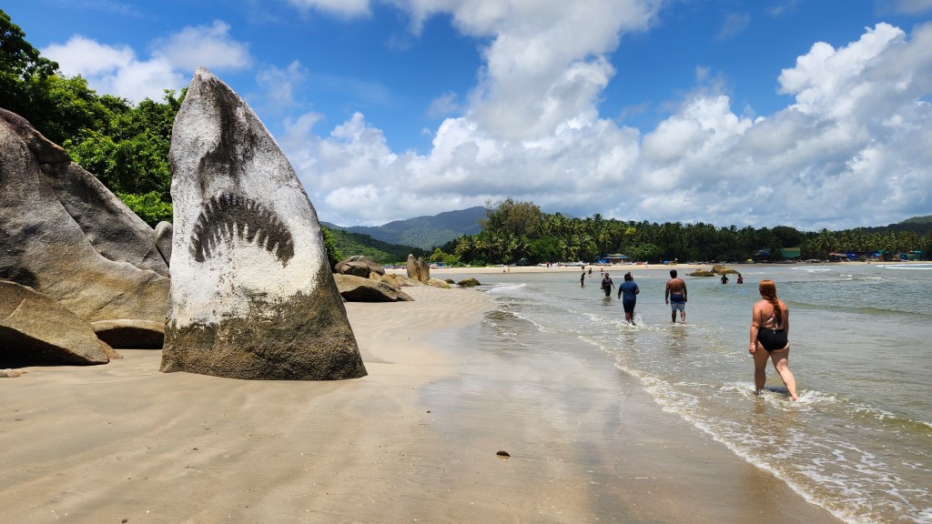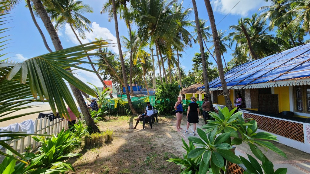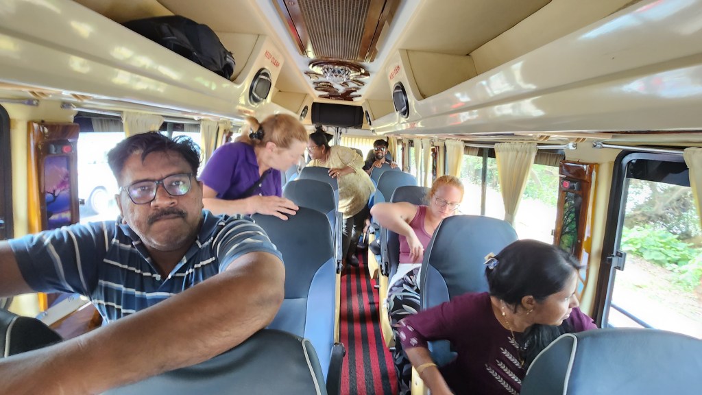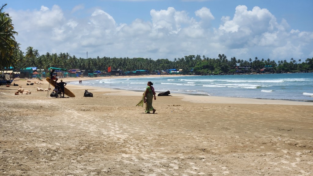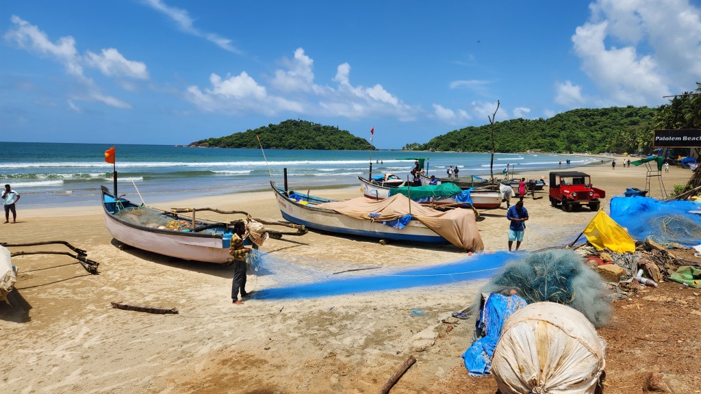 When Kingston was at University in Mumbai, he several times joined a group of friends for a getaway to Goa, some of whom would drive their scooters the 14 hours to Goa. Kingston would take the train and rent a scooter in Panaji for the two hour drive to Palolem Beach in south Goa. The beach is considered Goa’s most beautiful and is rated India’s fifth best beach. It is also far enough away from the tourist crowds of Panaji that it is rarely crowded. It’s mile long crescent shaped sandy beach is lined with shacks that are very inexpensive. The slope of the beach increases very gradually, which drastically reduces the ocean currents that are an issue at other Arabian Sea beaches in India. This makes the beach safe for average swimmers. Our first two days in Goa had been HOT under clear blue skies, so a chance to dip into the ocean appealed to everyone. Having experienced swimming the sandy beaches of North Carolina, Kingston also wanted to dispel our impression that Indian beaches were not very safe for swimmers. So we loaded everyone onto the mini-bus for the two hour drive south to Palolem Beach.