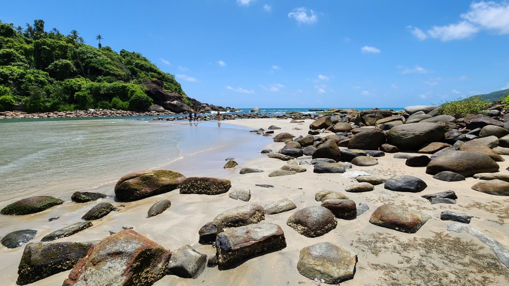 There was such a gentle slope to the beach that we had to wade out fairly far from the beach to be in water deep enough for swimming. Although the breakers of the Arabian Sea were not particlularly high, Lena and I did start bodysurfing the bigger waves. The preteens of Kingston’s family (and his brother-in-law) had never seen that and immediately wanted instructions. Before long, even some Indian tourists asked for lessons. Well that attracted the attention of the Indian lifeguards who became concerned that the Indians were not good enough swimmers to be trying to ride the waves. So we were all called back into shallower waters. With that fun over, we decided to walk North along the beach to the rocky beach named Sunset Point.