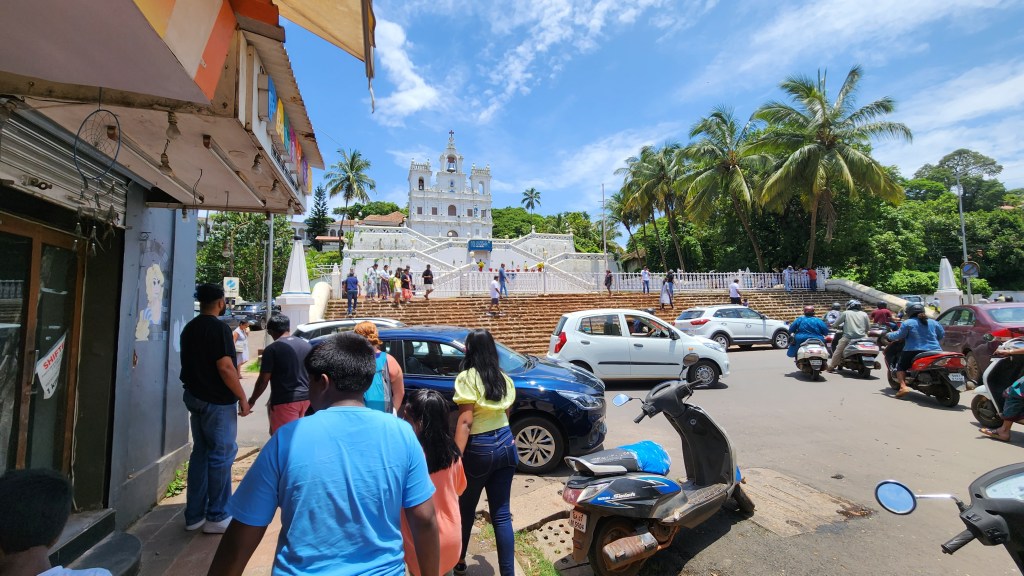 Our return flight to Mumbai was not until late afternoon, so the adults gave the kids a long time for a final splash in the hotel pool. Then we loaded up the mini-van and drove to downtown Panaji. We parked near the main square named Praca Da Igreja (Church Square), because it is at the base of the hill on which the baroque style Our Lady of the Immaculate Conception Church is built. The main tower in the center of the Church facade features the bell from the St. Augustine monastry in Old Goa that was moved here in 1871.