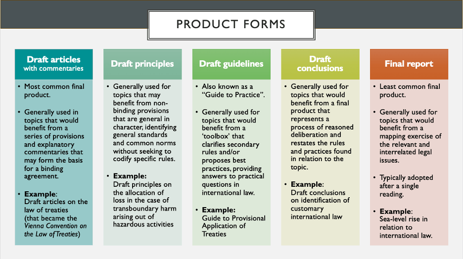 According to the textbook on the ILC,[1] which is created by the UN Secretariat’s Office of Legal Affairs (Codification Division), the Commission’s final output when considering a particular topic may take one of several forms: